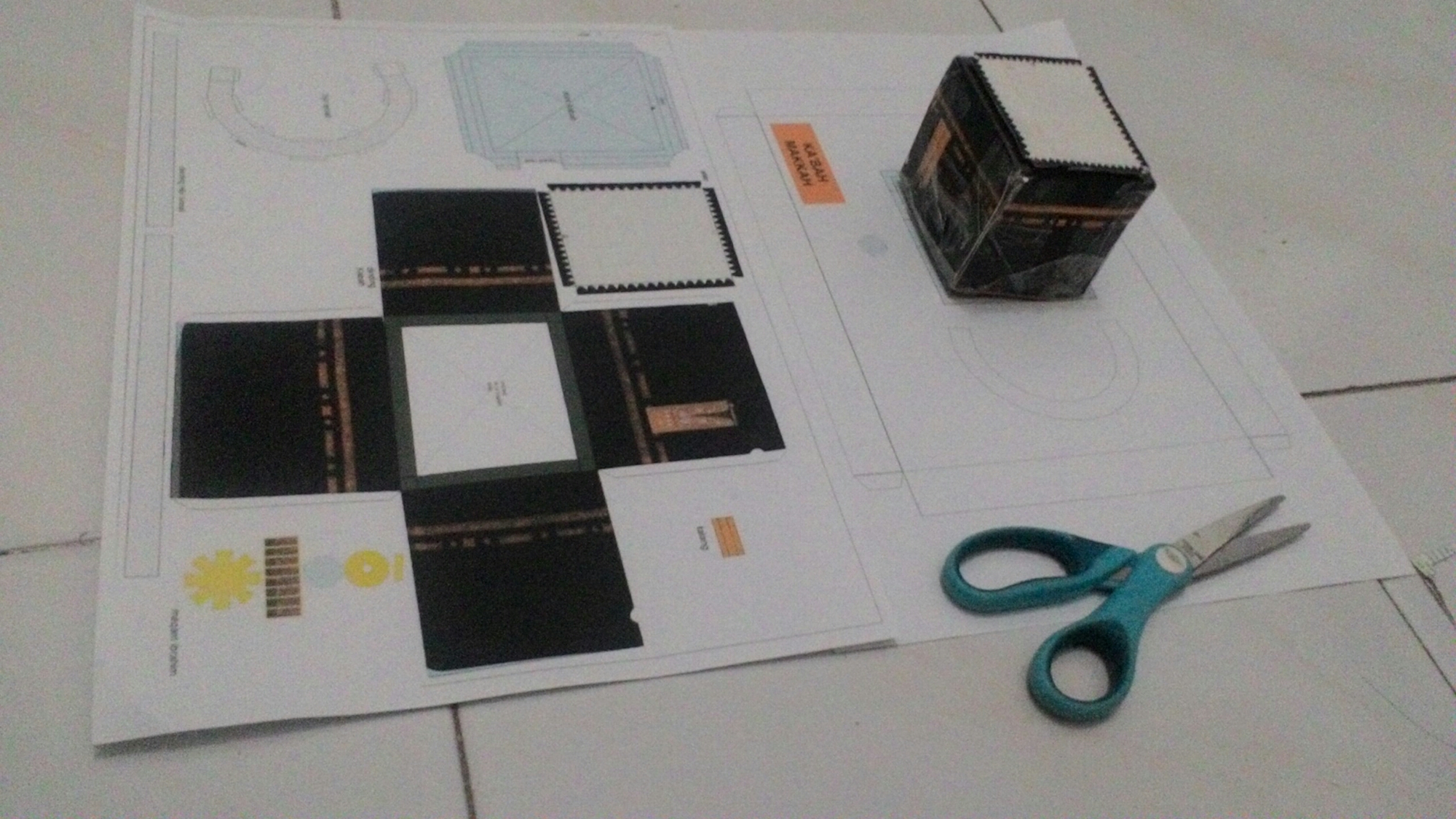 Buat sendirikah? Oh, tentu saja.. tidak. Hehe.. saya unduh dari sini . Supata mudah, saya unggahkan ya. Klik saja gambar di bawah ini untuk mengunduh. Saya cetak menggunakan kertas A4 lalu ditempel di kotak susu bekas. Awalnya terpikir menggunakan kertas foto, tapi ah sudahlah… biar hemat. Ohya, biar Ka’bahnya gak mleyot (apa ya bahasa Indonesianya?), saya isi kertas sampai penuh. Silahkan berkreasi.