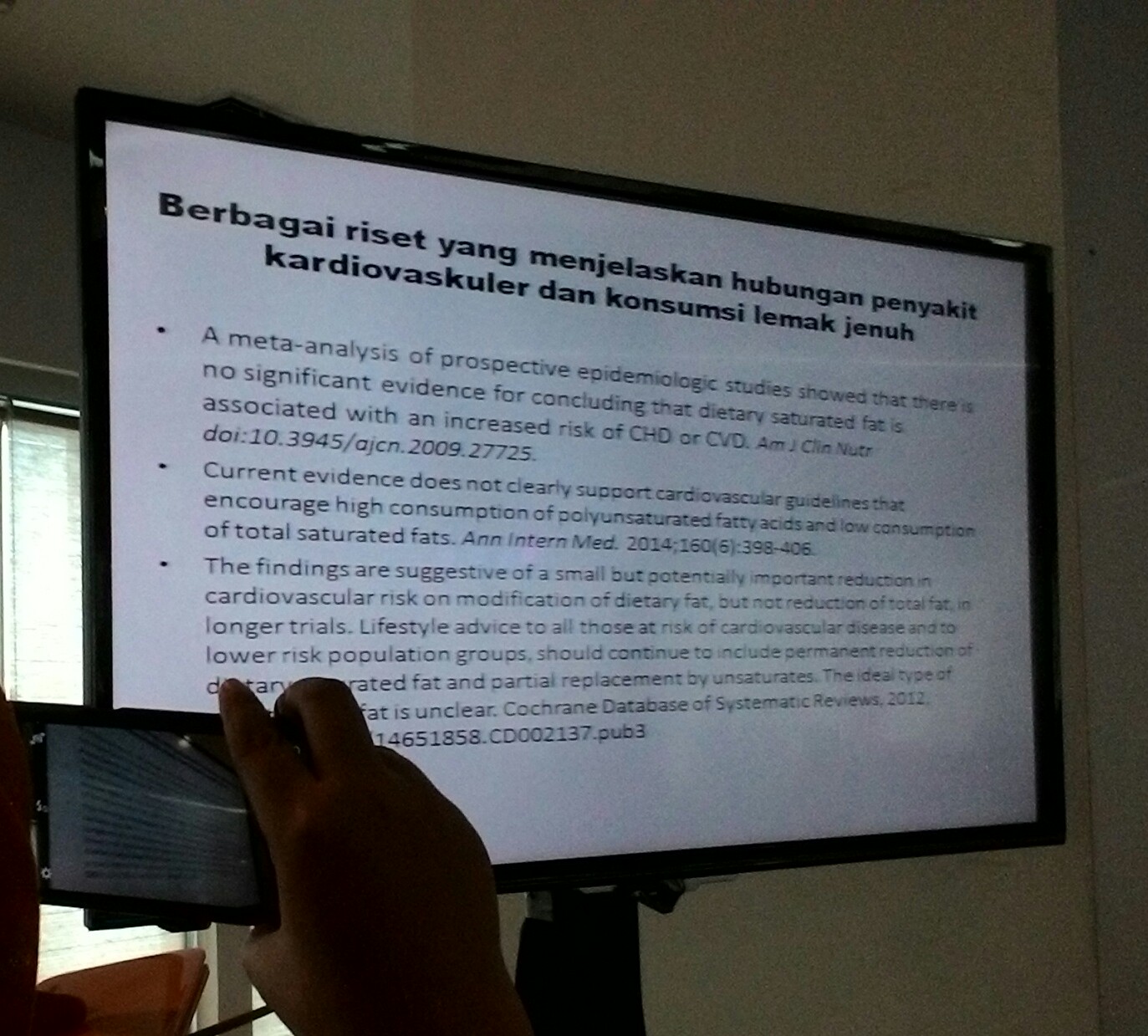Pemaparan dr. Tirta Prawita Sari, M.Sc, Sp.GK. dimulai dari penelitian-penelitian mengenai lemak jenuh dan lemak trans. Ternyata, derasnya informasi membuat masyarakat kita percaya bahwa penyakit jantung itu disebabkan oleh lemak jenuh. Padahal, dari beberapa riset yang beliau bawakan dalam slide di bawah ini, tidaklah demikian.