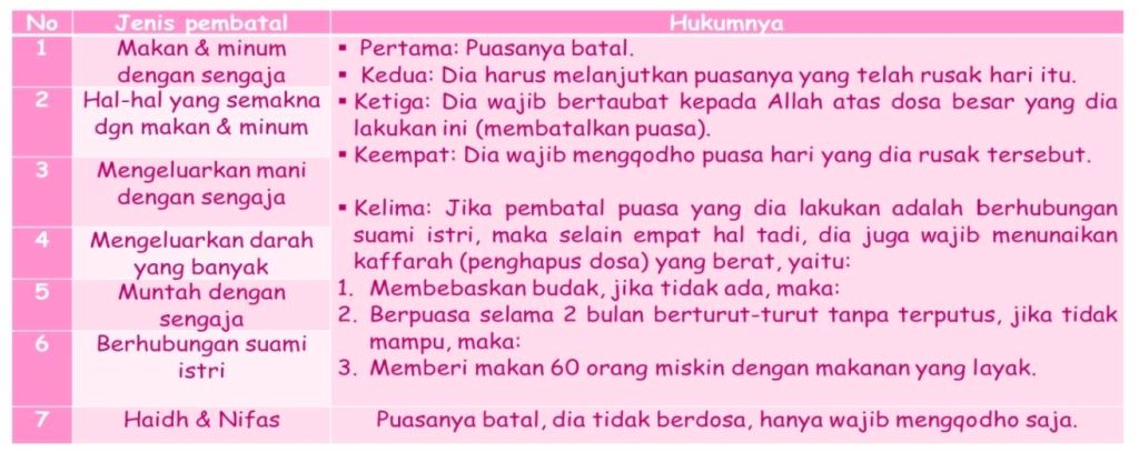 - Jika seseorang melakukan salah satu di antara enam pembatal puasa (Makan & minum dengan sengaja, hal-hal yang semakna dengan makan & minum, berhubungan suami istri, mengeluarkan mani dengan sengaja, mengeluarkan darah yang banyak & muntah dengan sengaja), maka puasanya batal, jika: